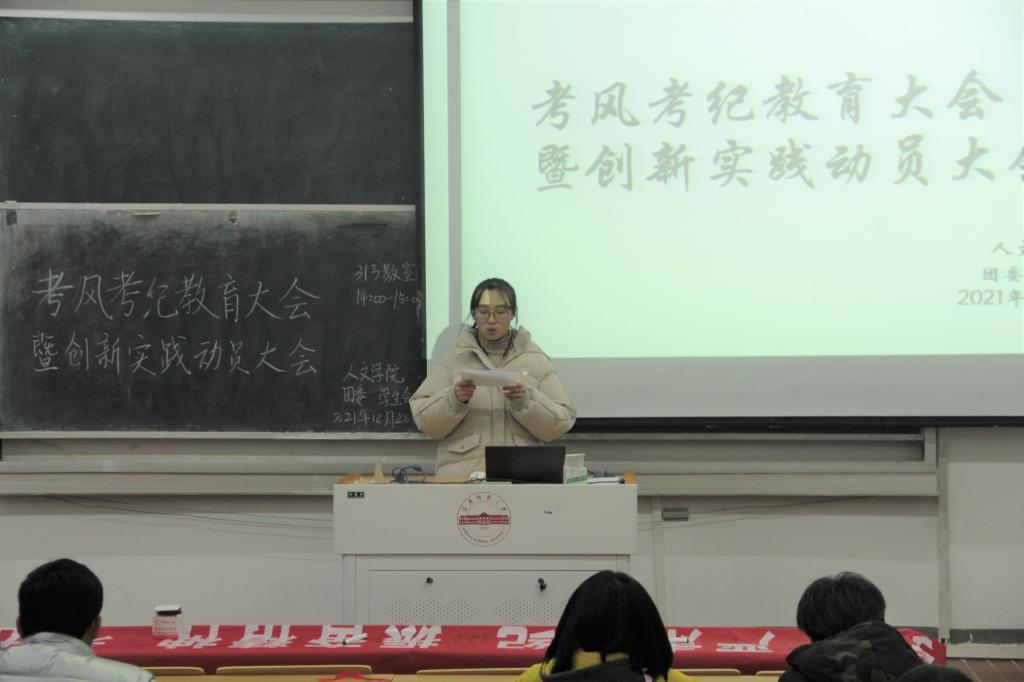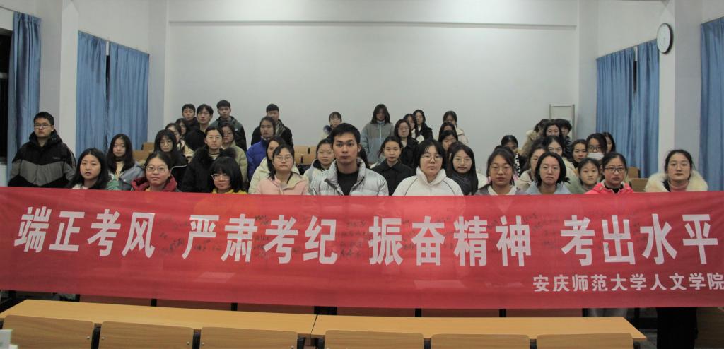 会上,2021级中国语言文学六班王安琦同学代表全院学子发出诚信考试倡议:认真复习,积极备考;严于自律,立己达人;提高修养,端正态度;严守考纪,诚信应考,用真实的实力和负责的态度向自己、父母、老师、学校交上一份满意的答卷。
