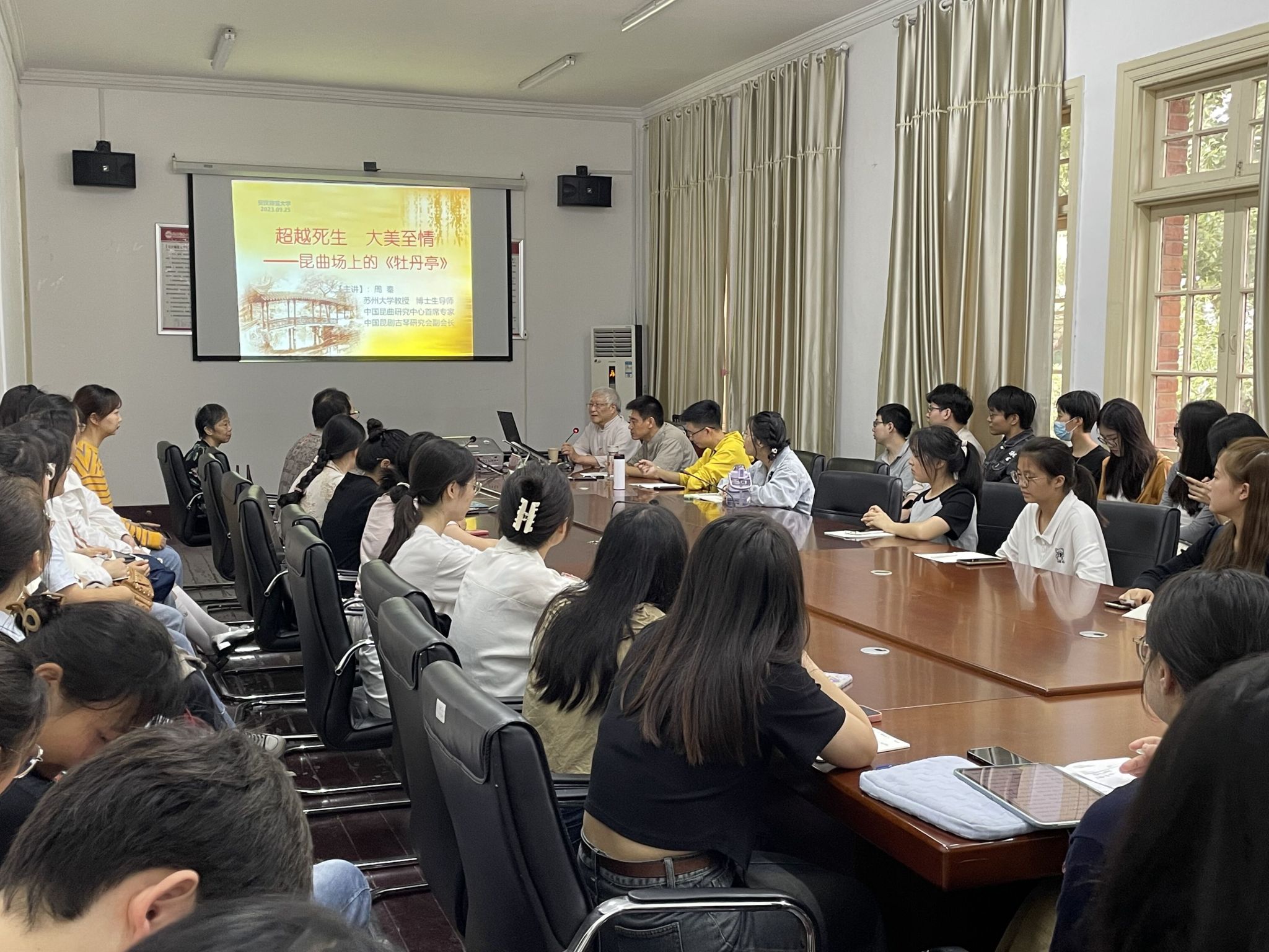 9月25日下午,苏州大学文学院教授、博士生导师、中国昆曲研究中心首席专家周秦应邀做客敬敷人文讲坛,主讲题为“超越死生 大美至情——昆曲场上的《牡丹亭》”的学术讲座。讲座由Beat365中文官方网站皖江文化数字化保护与智能处理省级重点实验室执行主任童岳敏教授主持,Beat365官网青年教师及研究生50余人聆听了本次讲座。