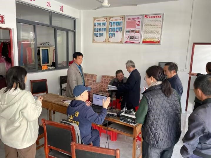 随后,调查组前往岳西县田头乡高腔剧社进行调研,当地高腔传承人向大家表演了传统岳西高腔——围鼓坐唱。围鼓坐唱是岳西高腔的表演形式之一,演唱者不用妆扮,分唱剧中角色,各执打击乐器,由鼓板师领头,一唱众和。调查组发现,围鼓坐唱的曲词中蕴含大量的方言唱词,是研究岳西方言的绝佳语料。下午,调查组前往岳西高腔县非遗传承人家中采录方言语音资料,并在其他几位发音人的配合下,顺利完成了语音采录工作。