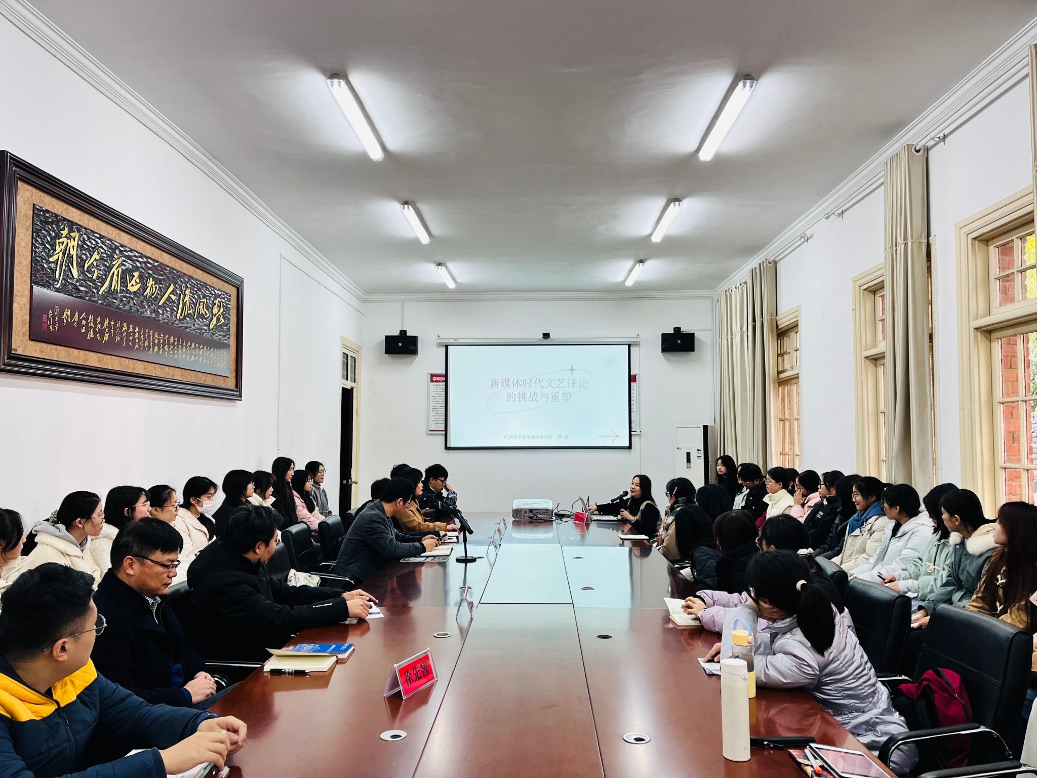 12月6日下午,文艺评论家菱湖大讲堂第一期成功举办。中国文艺评论家协会理事、广东省文艺评论家协会副主席、广州市文艺评论家协会主席、国家一级编剧罗丽应邀作了题为“新媒体时代文艺评论的挑战与重塑”的精彩讲座。本次讲座由安徽省文艺评论家协会副主席,Beat365中文官方网站美学与文艺评论研究中心主任江飞教授主持,Beat365中文官方网站副院长周红兵、中心副主任陈宗俊教授和专职研究员以及学院“文典班”、研究生近五十人参与。