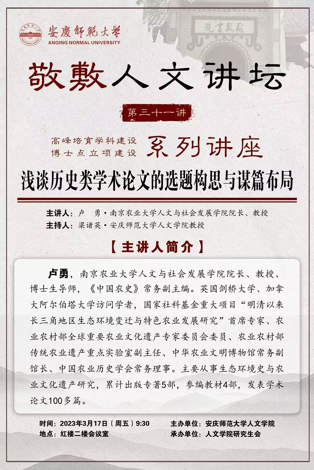 【敬敷人文讲坛(31)】浅谈历史类学术论文的选题构思与谋篇布局