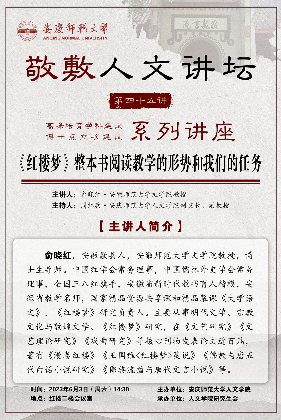 【敬敷人文讲坛(45)】《红楼梦》整本书阅读教学的形势和我们的任务