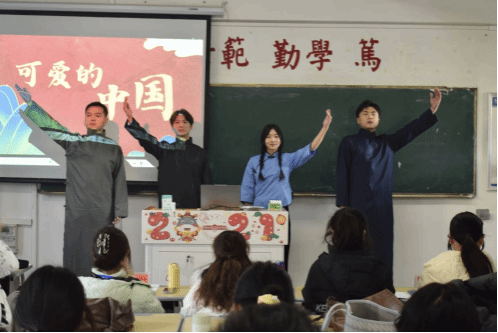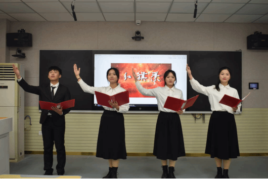 来自传媒学院的徐梓豪、柳徐耀、程哓峰和高晴晴身着独具民国特色的学生装,他们用抑扬顿挫的声音描摹着《可爱的中国》。“黑夜给了我黑色的眼睛,我用它看见了光明!”微微发颤的声线诉说着祖国久经磨难的委屈,高亢的声调发出振聋发聩的呐喊,那是对光明的渴求,更是对祖国美好未来的殷切期盼,朗诵者高举的拳头是青年们虽生逢盛世,仍以中流击水的气魄为可爱的中国奋发向上的坚定信念。