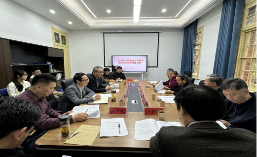沈志富就中国语言文学硕士学位授权点周期性合格评估的准备情况、院内专家和校内专家评审情况做了汇报说明。金松林从学位授权点基本情况、师资力量与科研成果、招生与人才培养体系、服务经济社会发展、存在问题与改进计划等五个方面汇报了学位点近五年来的建设情况。