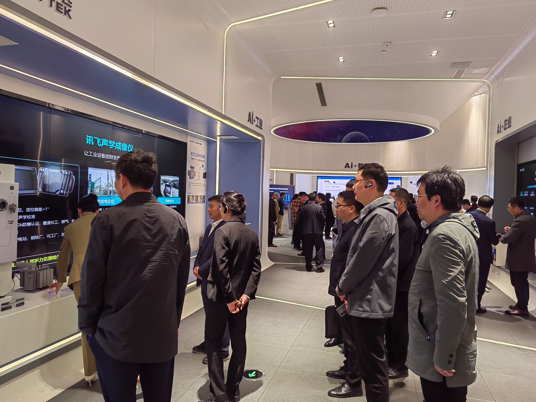 考察组一行首先参观科大讯飞人工智能展厅,听取科大讯飞公司的发展历程介绍、了解数字时代科大讯飞在智能语音、语言处理、认知智能等人工智能领域所取得的成绩。
