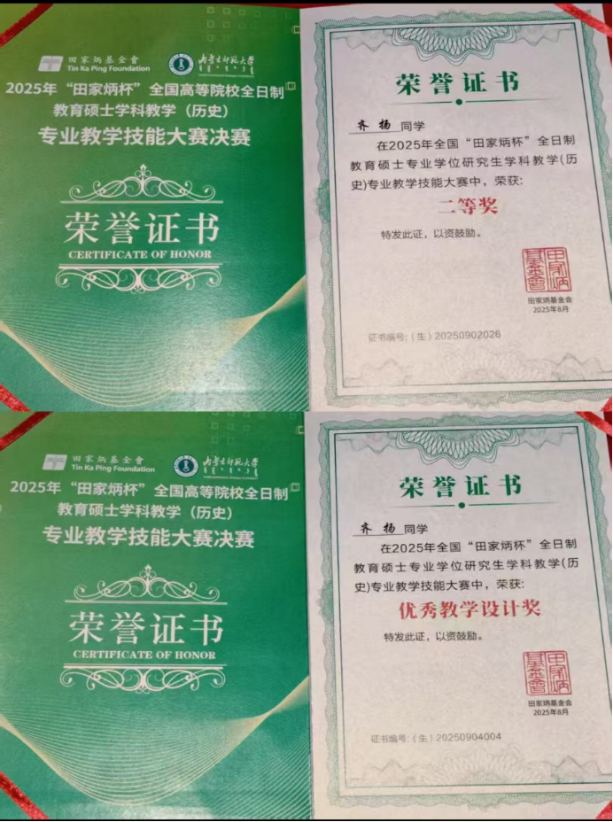 全国“田家炳杯”全日制教育硕士专业学位研究生学科教学(历史)专业技能大赛是目前教育硕士培养领域层次最高、规模最大、影响力最广的全国性大赛。本次赛事分初赛和决赛两个阶段。初赛线上举行,选手围绕初中新教材《中国历史·七年级上册》自选课程进行设计,提交教学设计和10分钟教学视频。决赛线下举行,分为现场抽题、限时备课、现场授课、即时答辩四个环节,综合考察选手对历史学科知识的熟练掌握程度,以及选手快速教学设计、课堂驾驭能力和临场应变能力。经过激烈角逐,齐扬同学获二等奖和优秀教学设计奖,魏爽同学获三等奖和优秀教学设计奖,董根明教授荣获“优秀指导教师奖”。