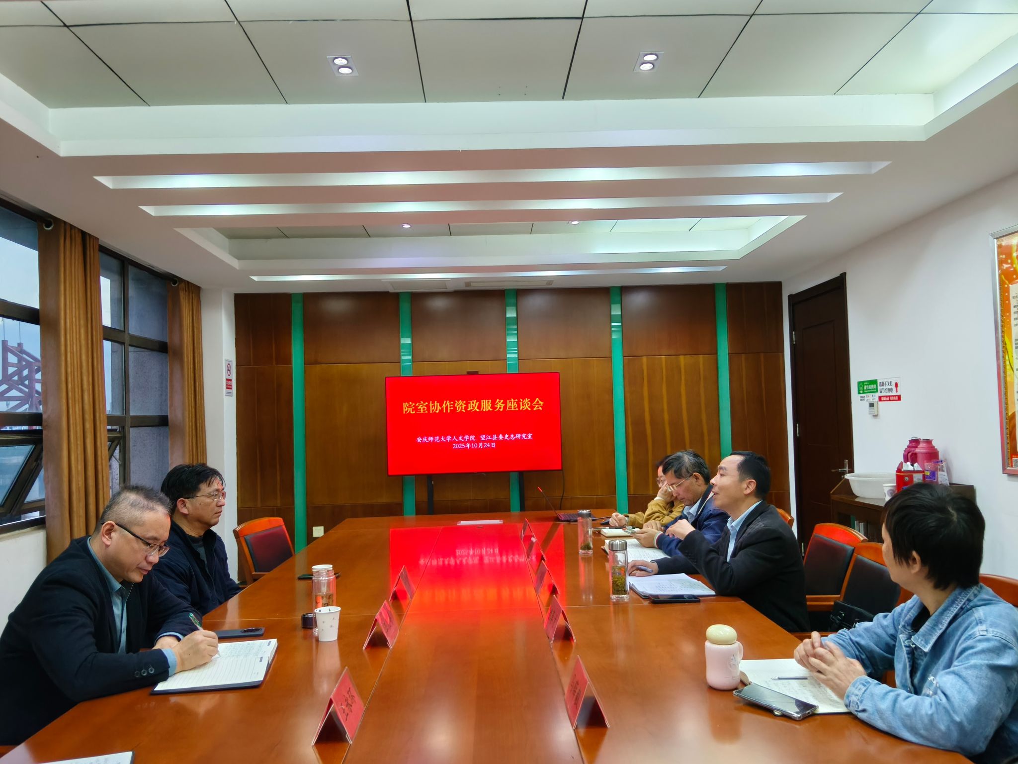 汪孔丰介绍了学院的师资队伍、学科建设、服务地方经济社会发展等情况。他指出,学校深入贯彻习近平总书记在安徽考察时的重要讲话精神,聚焦国家重大发展战略,成立了长江文化研究院,将学校的发展和地方文化发展有效结合,积极服务地方经济社会发展。望江县历史悠久,文化资源丰富,期待学院在“十五五”发展阶段加强与研究室的合作。他重点介绍了学院正在整理的乾隆三十三年《望江县志》,希望两个单位能够合作完成整理出版工作。随后双方重点就望江旧志整理、资政报告撰写等工作进行了富有成效的交流。