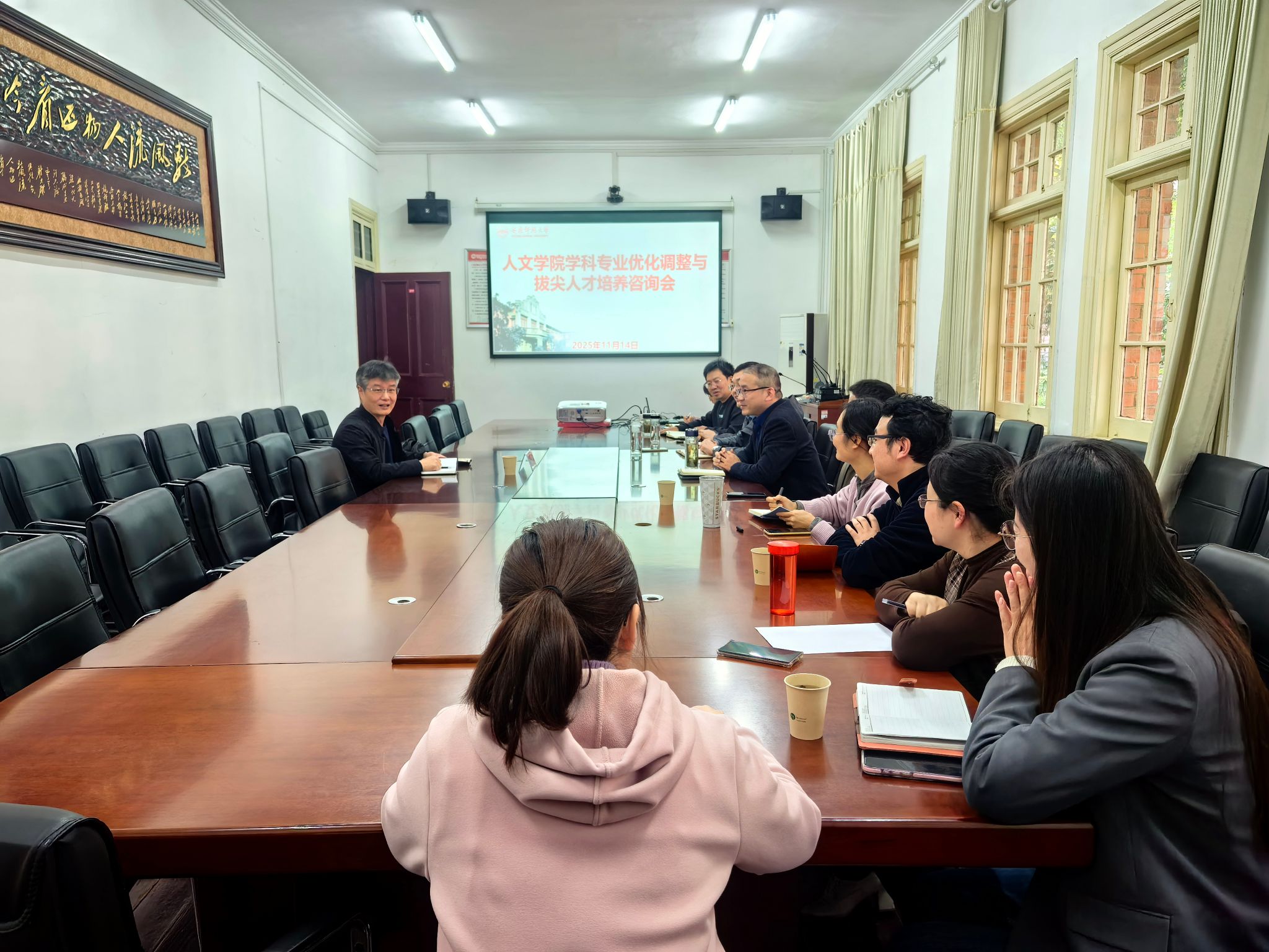 为主动对接新文科建设战略要求,深化应用型人才培养改革,破解学科专业发展瓶颈,11月14日,Beat365中文官方网站召开学科专业优化调整与拔尖人才培养咨询会。会议特邀安徽师范大学文学院院长、博士生导师项念东教授莅临指导,学院领导班子成员、骨干教师代表、相关科室工作人员参会,院长汪孔丰主持会议。