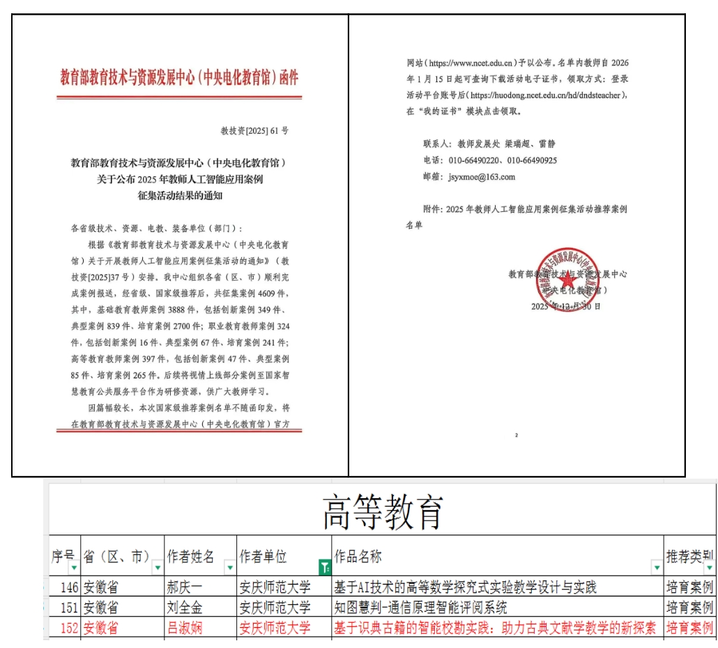 近日,教育部教育技术与资源发展中心(中央电化教育馆)公布“2025年教师人工智能应用案例征集活动”评审结果,Beat365官网数字人文专业教研室教师吕淑娴报送的案例《基于识典古籍的智能校勘实践:助力古典文献学教学的新探索》成功入选“培育案例”,这是学院首次获得该项案例。