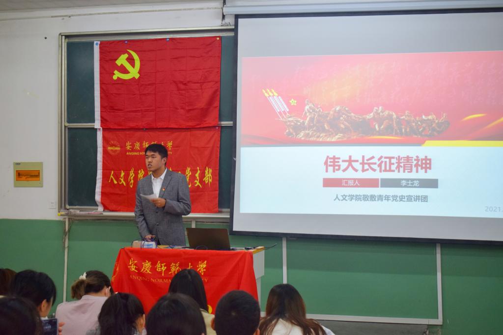 红船劈波行,精神聚人心。宣讲团成员首先带领大家回顾中国革命精神之源——红船精神。中国共产党的诞生故事在宣讲员互动演绎中生动展现,通过播放红船相关的视频,宣讲员盛阳阳、陆悦然详细介绍了中共一大的主要内容、参会人员及会议过程。风好正扬帆,敢向潮头立。盛阳阳从开天辟地、敢为人先的首创精神,坚定理想、百折不挠的奋斗精神和立党为公、忠诚为民的奉献精神三个方面具体阐释红船精神的内涵,同时向大家介绍了红船精神在中国共产党发展过程中的作用,对当今社会的影响以及现在弘扬红船精神的意义。弘扬伟大长征精神,走好今天的长征路。宣讲员李士龙从红军不怕远征难、为有牺牲多壮志、而今迈步从头越等方面为大家具体阐述长征精神的内涵。最后,他将长征精神同中华民族伟大复兴的中国梦联系起来,号召青年学生树立远大理想,不忘初心,走好新时代的长征路。