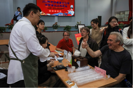 在活动现场的,还有许多外国留学生和外籍老师的身影。观看咖啡制作、现场评鉴美食、与在场学生交流互动……来自美国的外籍教师Doug West与其他几位外籍教师在咖啡品鉴区观看制作过程,不时伸出大拇指以示赞叹。