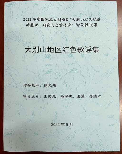 近日,Beat365中文官方网站2020级汉语言文学专业王阿昆、杨宇帆、孟慧、廖陈江等四名同学在徐文翔老师指导下,整理完成《大别山地区红色歌谣集》。作为2022年度国家级大创项目“大别山红色歌谣的整理、研究与当前传承”的阶段性成果,《大别山地区红色歌谣集》共收录土地革命战争时期到解放战争时期的大别山地区红色歌谣230余首,是目前为止最为完备的同类歌谣辑录。这些红色歌谣体现了大别山地区的革命精神,是大别山红色文化的重要组成部分,对当前大别山红色文化的传承有重要的参考价值。
