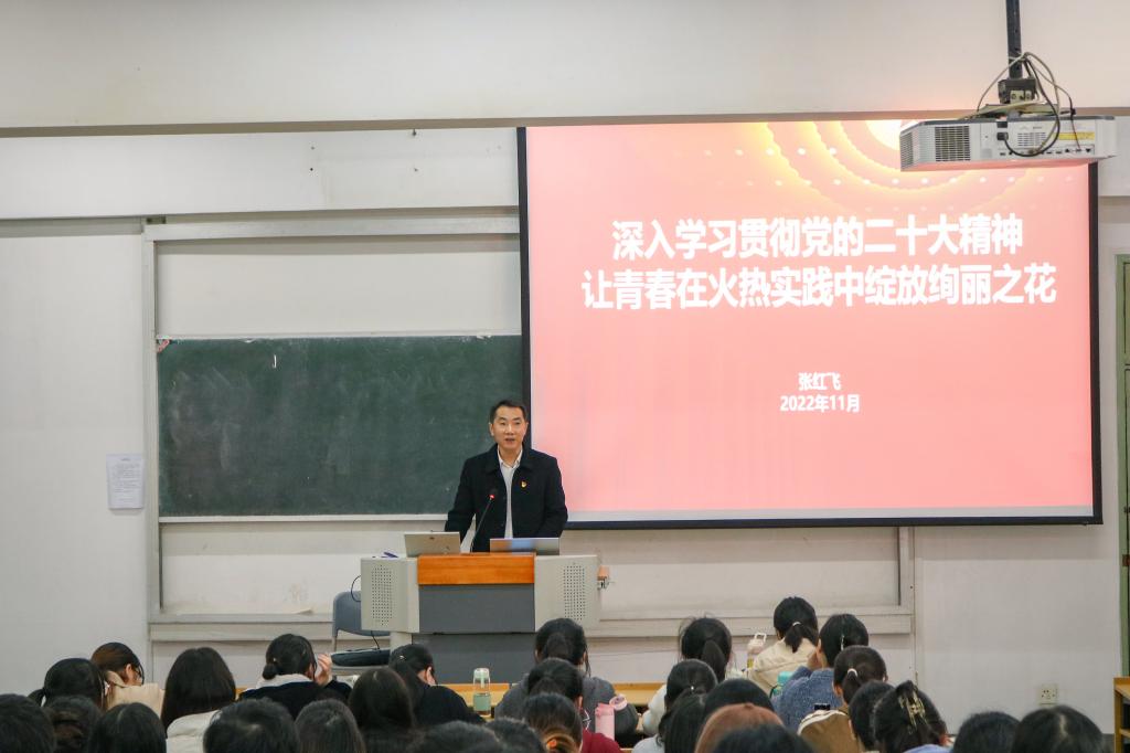 11月23日,Beat365中文官方网站举行党的二十大精神宣讲报告会,学院党委书记张红飞在教学楼414教室作“深入学习贯彻党的二十大精神 让青春在火热实践中绽放绚丽之花”主题宣讲。学院第66期入党积极分子培训班和第23期发展对象培训班120余名学员聆听宣讲报告。