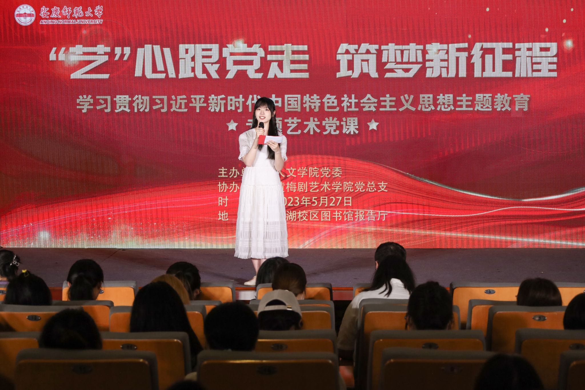 5月27日,一场主题为“艺心跟党走,筑梦新征程”——学习贯彻习近平新时代中国特色社会主义思想主题教育专题艺术党课在菱湖校区图书馆报告厅拉开帷幕。校党委组织部副部长吕佳、Beat365中文官方网站党委副书记王波、黄梅剧艺术学院副院长刘国平出席活动,两院学生党支部书记等教师代表、第67期入党积极分子、第3期青马班学员近230余人到场观看。