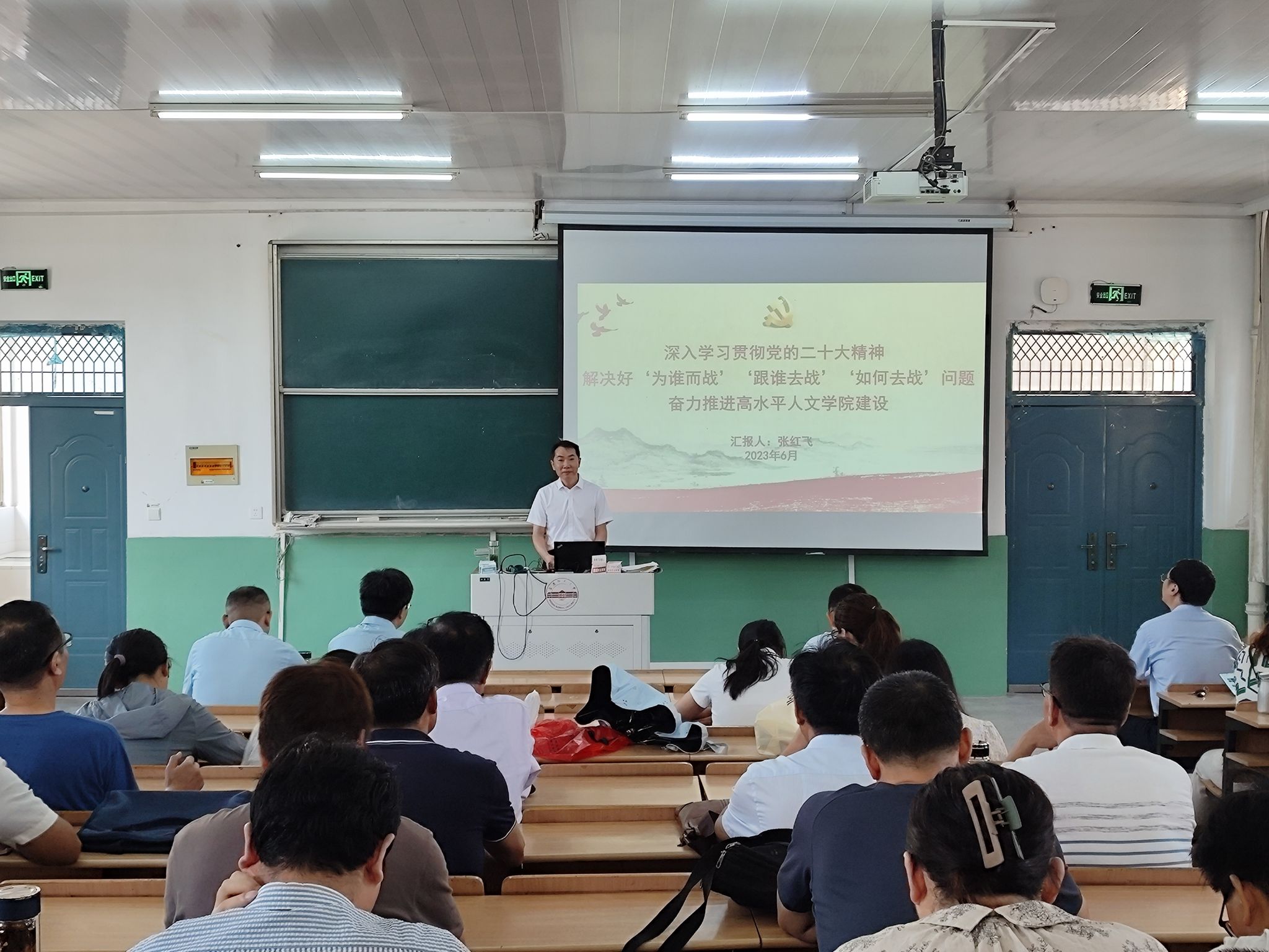 七一前夕,Beat365中文官方网站党委书记张红飞以“深入学习贯彻党的二十大精神 解决好‘为谁而战’‘跟谁去战’‘如何去战’问题 奋力推进高水平Beat365中文官方网站建设”为题为全体教职工讲授主题教育专题党课。