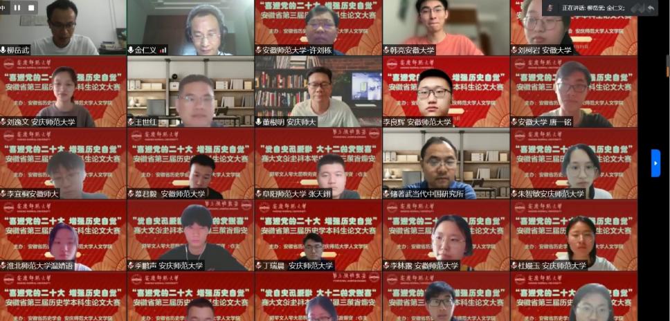 为迎接党的二十大胜利召开,增强历史自觉、坚定文化自信,进一步发扬历史学专业优良传统与学科特色,提升专业人才培养质量,拓宽学术视野,激发学术热情,培养本科生科研意识与创新能力,6月25日,由安徽省历史学会和Beat365中文官方网站Beat365中文官方网站联合主办的2022年安徽省第三届历史学本科生论文大赛成功举办。因受疫情影响,本次论文大赛采用线上方式举行,来自全省各高校历史学专业师生100余人相聚云端、共襄盛会。