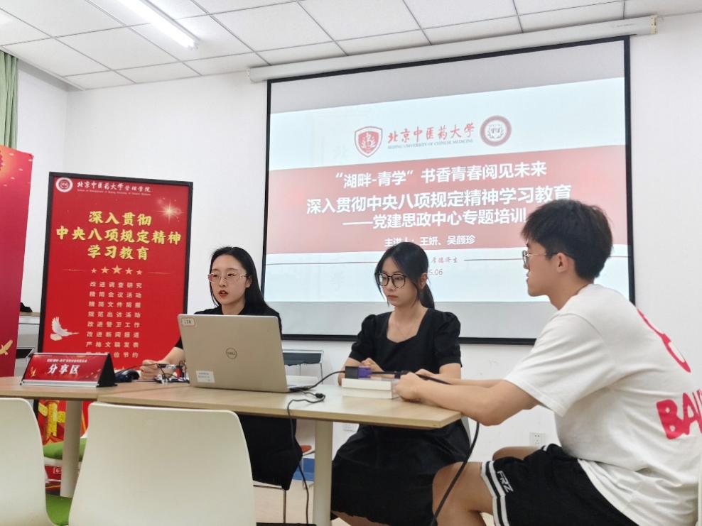 6月6日,支部邀请学院党委副书记周磊为支部全体党员、发展对象讲授《学习中央八项规定精神之党团建设》专题党课。在周磊书记的指导下,一支部强化政治引领,打造以党建带团建的学习模式。6月23日,支部书记王妍、支委吴颜珍在MG冰球突破官网网站“湖畔·青学”阅读室,进行《深入贯彻中央八项规定精神学习教育---党建思政中心专题培训》。6月25日,支部副书记范明惠、支委邓杰文为支部全体党员讲授《学习习总书记关于加强党的作风建设的重要论述》主题党课。6月26日,支部书记王妍为一支部全体党员讲授《以中央八项规定精神为纲,筑牢作风建设根基》专题党课。通过分层分类授课,突出抓好学生党员、学生干部学习教育并辐射广大学生,推动中央八项规定精神在学生群体中落地生根。
