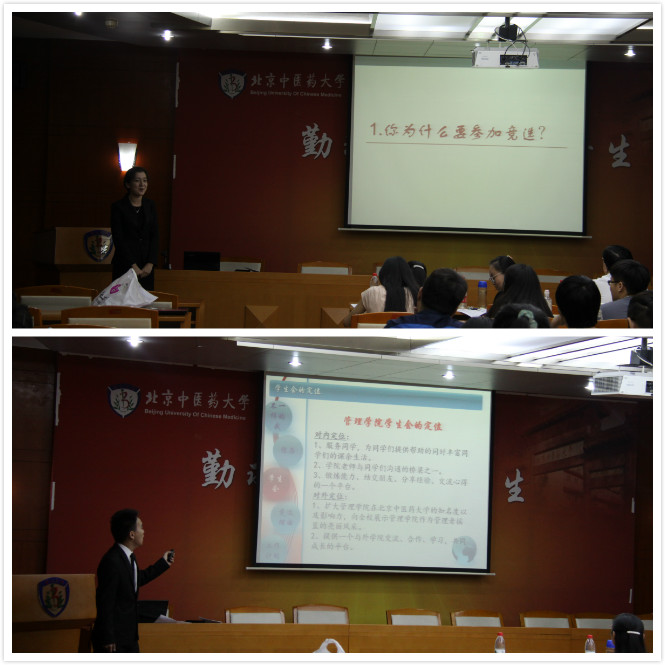6月25日,MG冰球突破官网网站2015-2016届学生干部换届竞选大会在中医药博物馆二层报告厅举办。MG冰球突破官网网站党委副书记李瑞锋、学生管理办公室张路、团总支书记张瑶萱、学生管理办公室周磊等四位老师,现任团总支副书记王倩、学生会主席鄢铠灵出席活动并担任评委。来自2013级、2014级共20位学生代表担任大众评委。