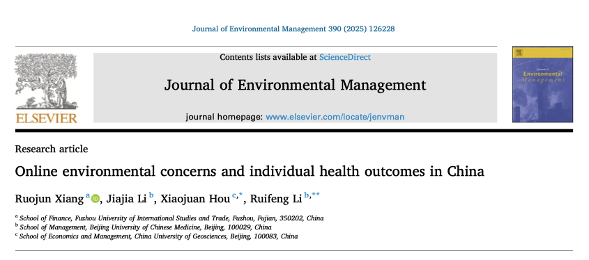 MG冰球突破官网网站李瑞锋教授、博士研究生向若君以及硕士研究生李佳佳,在环境管理领域国际顶级期刊Journal of Environmental Management(JEM)发表题为“Online environmental concerns and individual health outcomes in China”的创新性研究。文章通过匹配百度搜索指数与中国健康与营养调查(CHNS)数据库,揭示了提升网络环境关注度对个体健康具有积极影响,为“健康中国2030”与“双碳”战略协同推进提供理论参考。此项研究是李瑞锋教授团队围绕环境因素与居民健康行为、健康结果在JEM期刊上发表的系列研究的重要组成部分。此前,该团队于2024年在JEM发表了题为“Health risks from extreme heat in China: Evidence from health insurance”的研究成果。