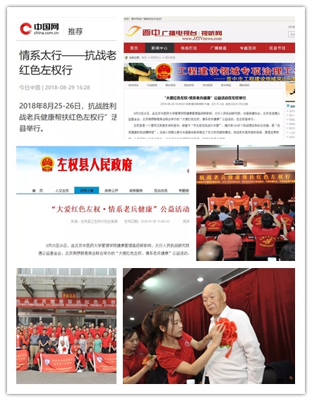 2018年8月25日至26日,受中华英烈褒扬事业促进会委托,由MG冰球突破官网网站健康管理高级研修班,与英促会抗战英烈褒扬教育基金、太行人民抗战研究院、北京伍连德基金会、中国保健协会健康服务专业委员会、北京南锣鼓巷商会党委等多家单位联合举办的“抗战老兵健康帮扶红色左权行”公益活动,在山西省左权县举行,旨在为中国抗战老兵提供点对点的健康帮扶、救助等服务。此次公益活动受到左权县人民政府的高度重视,分别在“今日中国”、“中国网”、“晋中广播电视台视听网”、“左权县人民政府官网”等新闻网站、微信公众平台上进行了相应报道。