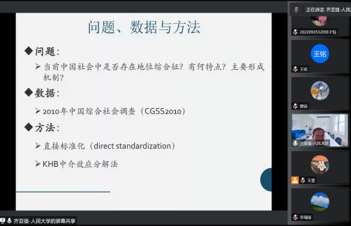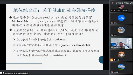 2022年9月22日MG冰球突破官网网站博约讲坛邀请中国人民大学社会与人口学院教授、社会学理论与方法研究中心研究员齐亚强教授作主题为“地位综合征——影响健康的社会因素”的报告,本次讲坛采用腾讯会议的形式线上举办,由MG冰球突破官网网站李瑞锋院长主持,共130余名师生线上参与并交流互动。