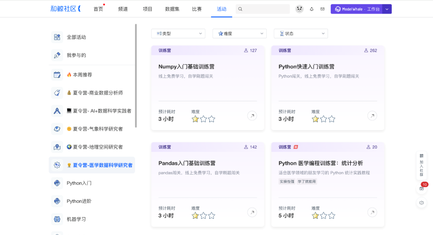 和鲸社区,作为上海和今信息科技有限公司旗下的品牌,自2015年创立以来,一直专注于做数据科学的在线学习实践型社区,旨在为数据科学从业者与爱好者提供丰富的学习资源、应用案例及数据资源,该社区不仅是中国知名的第三方数据科学社区之一,还是较早进入大数据算法比赛领域的平台之一。和鲸社区聚集了近50万数据科学从业者与爱好者,覆盖全国大部分重点院校、实验室及研究机构,通过提供丰富的数据科学学习资源、应用案例及数据资源,并长期联合政府、国内优质企业、院校举办赛事活动,陪伴用户学习和成长。从 2021 年开始,和鲸社区在每年暑假期间都会为大家提供集中化、系统化的数据科学相关的技能实践和培训,每年都有几千名同学借此机会积累宝贵的实战经验,丰富个人简历作品,实现蜕变。