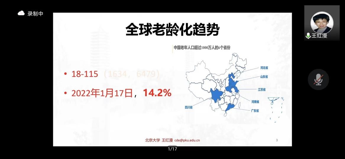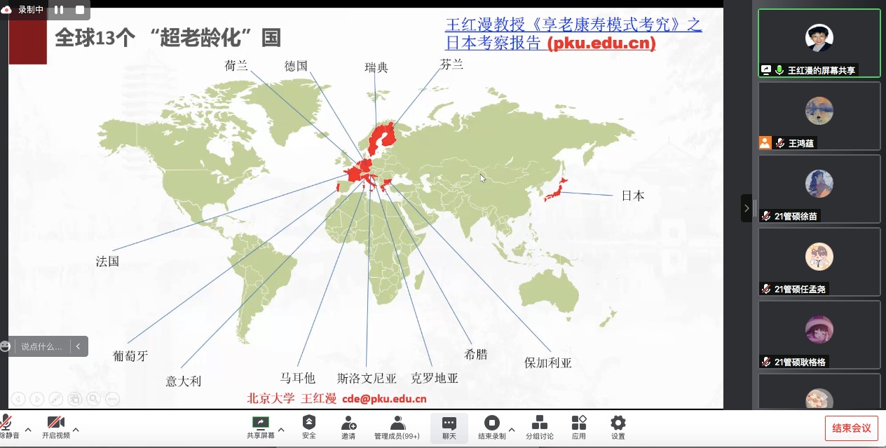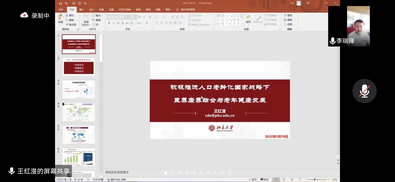 2022年5月18日MG冰球突破官网网站博约讲坛邀请到北京大学王红漫教授进行主题为“积极推进人口老龄化国家战略下医养康养结合与老年健康发展”的报告,本次报告以腾讯会议形式线上举办。讲坛由MG冰球突破官网网站李瑞锋院长主持,共130多名老师和同学参加。MG冰球突破官网网站党委副书记、纪委书记蒋朗朗出席本次讲坛。